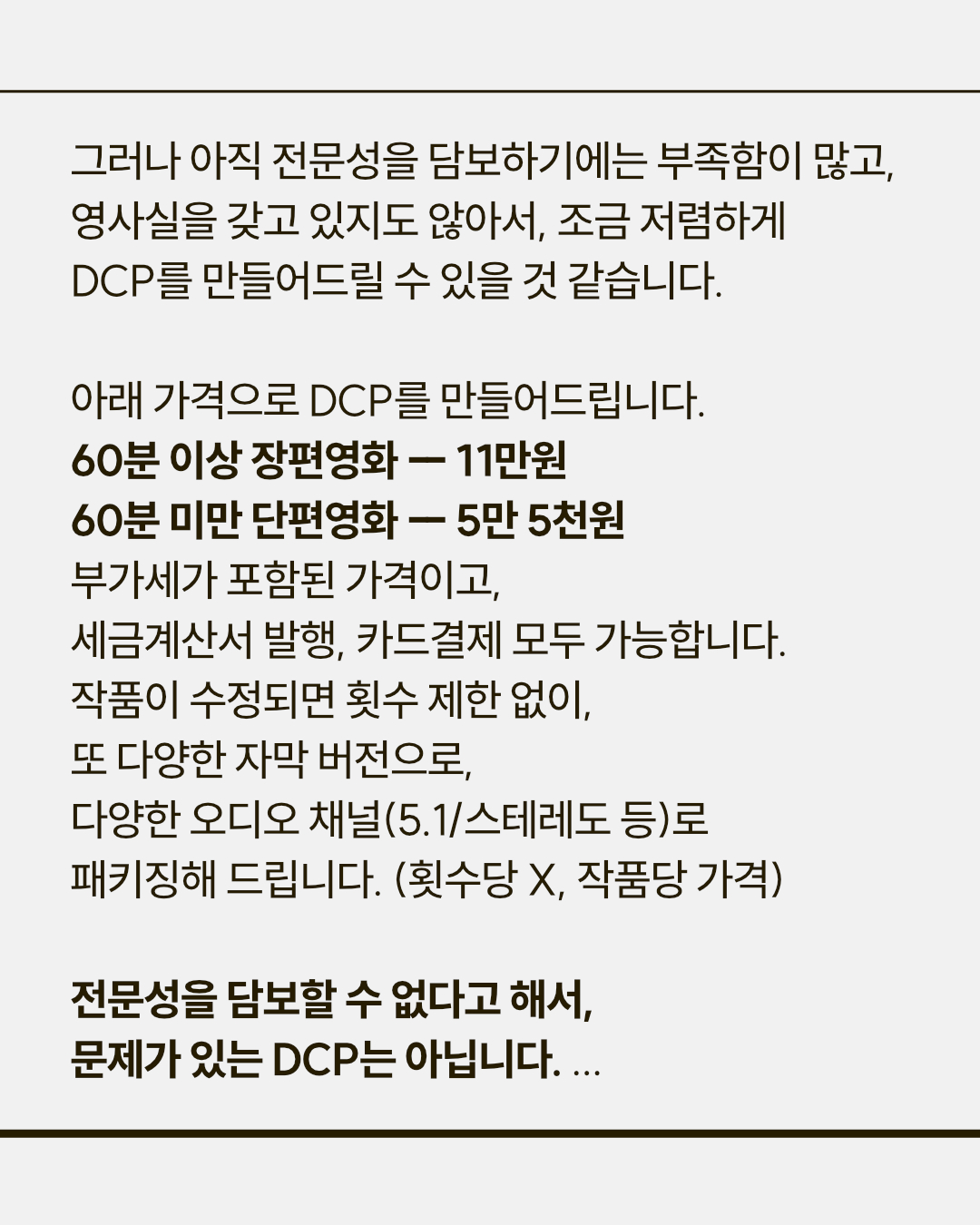 그러나 아직 전문성을 담보하기에는 부족함이 많고, 영사실을 갖고 있지도 않아서, 조금 저렴하게 DCP를 만들어드릴 수 있을 것 같습니다.